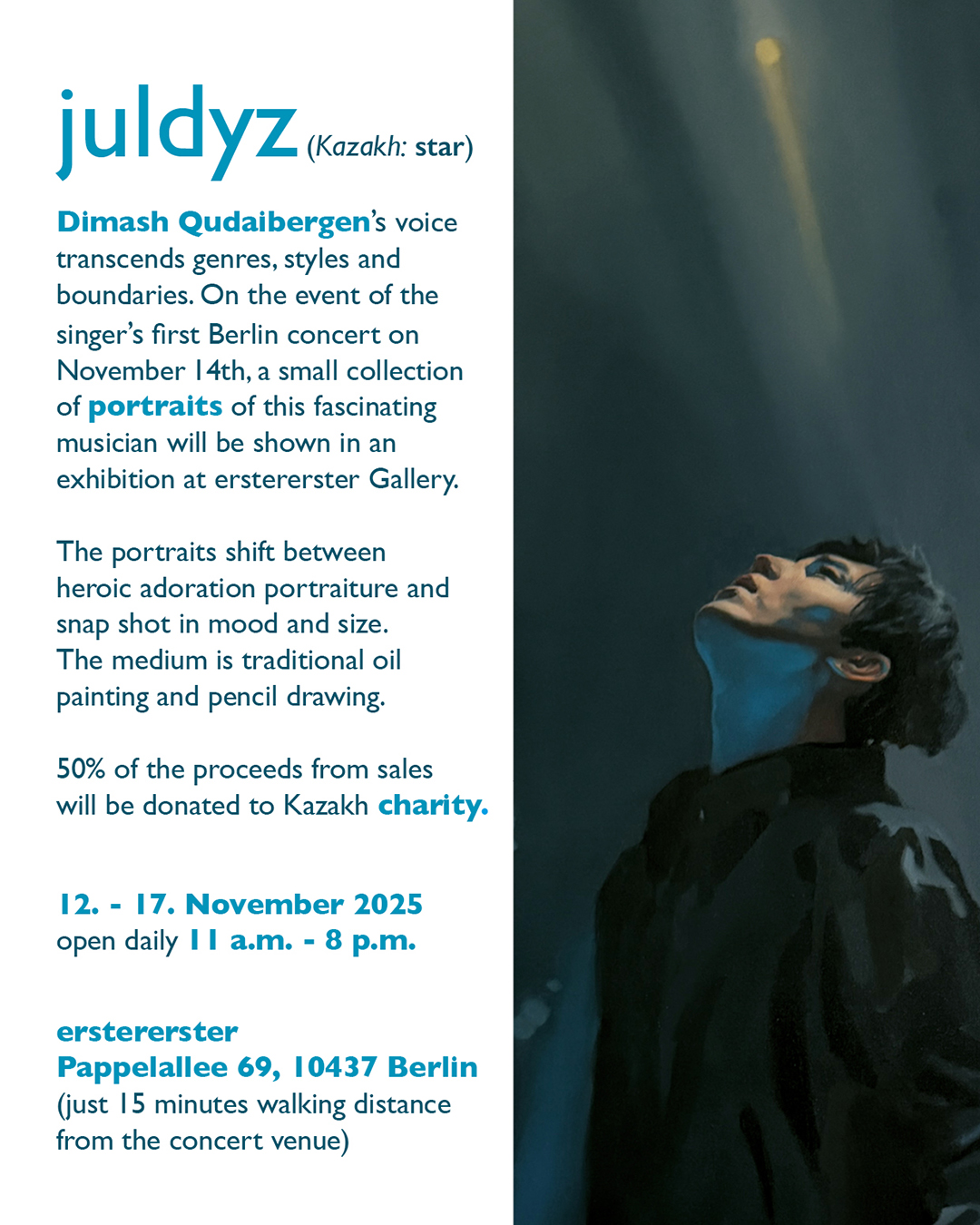 Dimash Qudaibergen’s voice transcends genres, styles and boundaries. On the event of the singer’s first Berlin concert on November 14th, a small collection of portraits of this fascinating musician will be shown in an exhibition at the erstererster Pop-up-gallery.